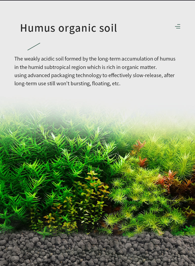 Formulated with weakly acidic soil formed by long-term accumulation of humus in humid subtropical regions, this fertilizer is rich in organic matter. Advanced packaging technology ensures effective slow-release performance – after long-term use, the granules won't burst, float, or deteriorate, maintaining substrate integrity and water clarity.