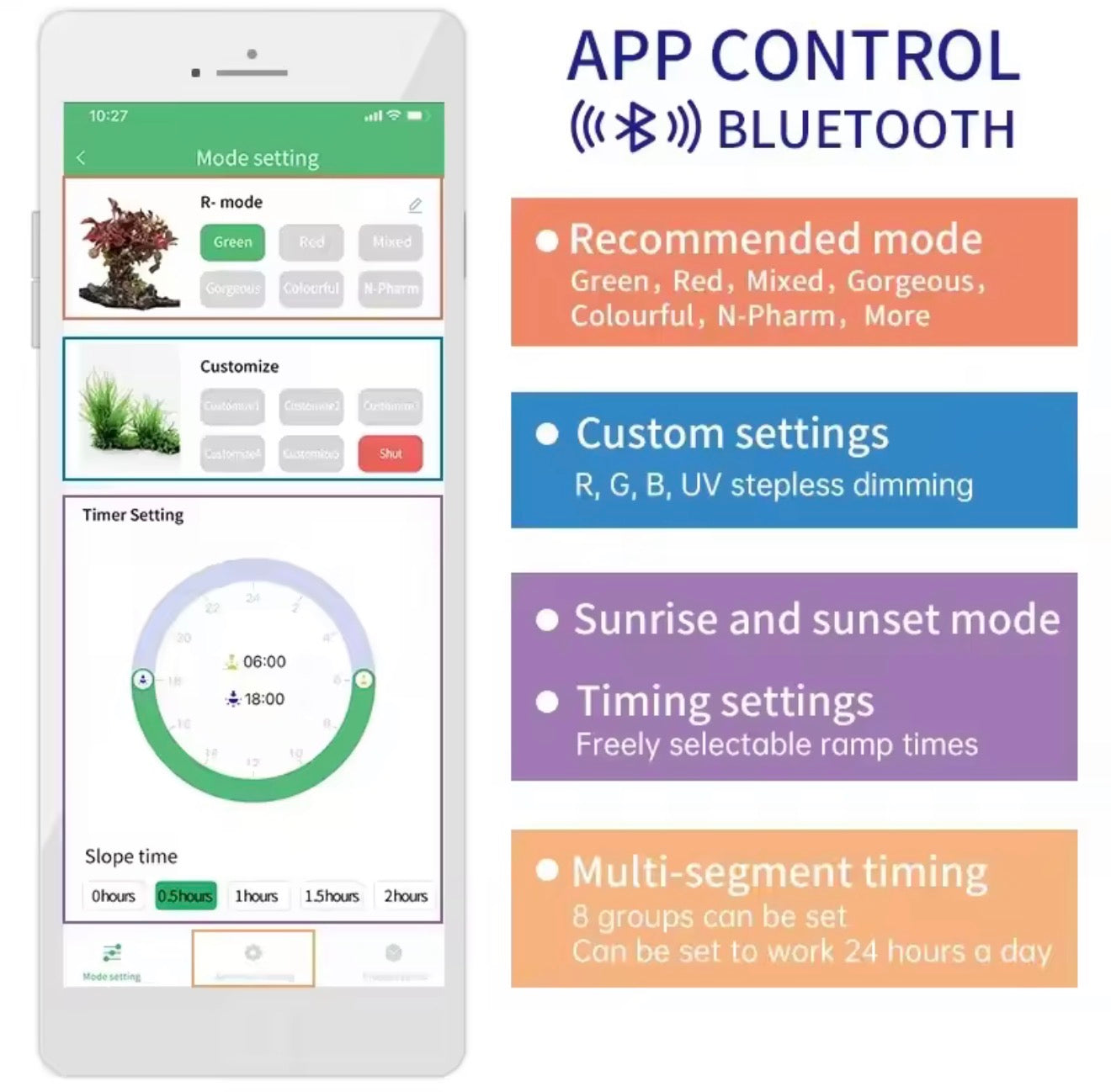The intuitive smartphone app allows you to control every aspect of your lighting - adjust individual color channels, create custom schedules, simulate weather effects, and save unlimited preset configurations. Compatible with both iOS and Android devices.